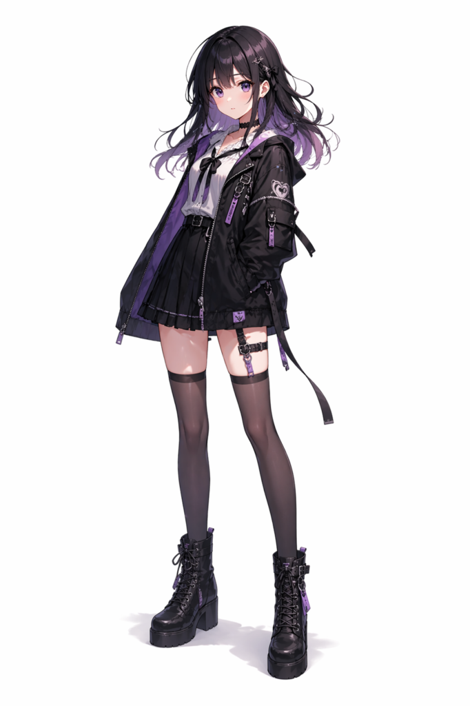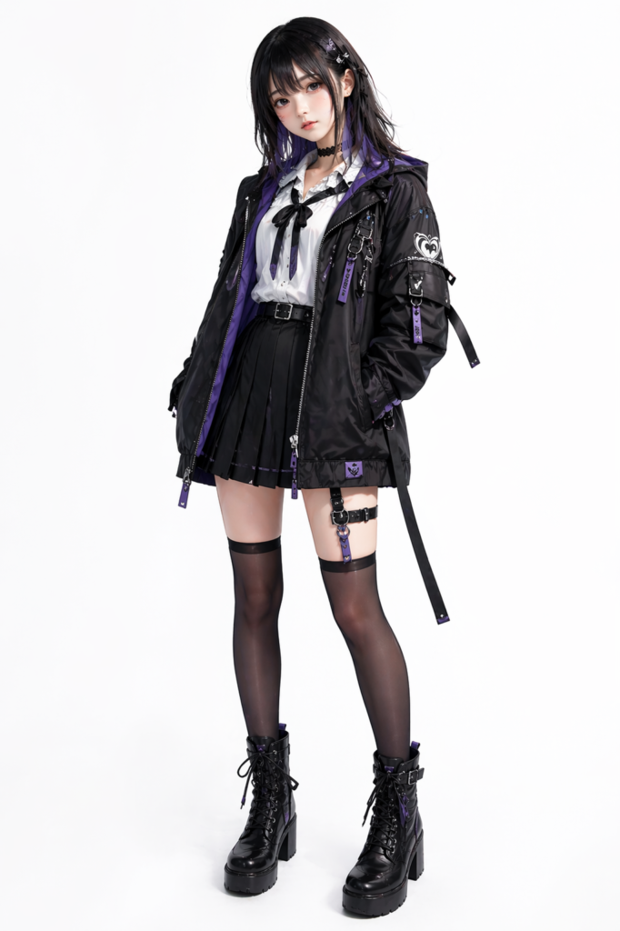 「黒髪に紫のハイライトが入ったミディアムヘア、紫色の瞳を持つ女の子キャラクターを、リアルな人物として実写化した高品質ポートレート。 黒と紫を基調としたゴシック×ストリート系のジャケット、白いブラウス、黒いリボンタイ、黒いプリーツスカート、黒のニーハイソックス、厚底の黒いレースアップブーツ、太もものストラップなど、衣装のディテールを忠実に再現。 髪の一本一本が自然に描写され、肌は滑らかでリアルな質感。 光はスタジオ撮影のように均一で、白背景でクリーンな印象。 キャラクターの雰囲気と魅力を保ちながら、写真のようなリアリティで実写化された女性モデルの姿。」