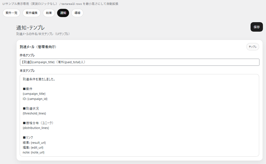 管理画面 UI(通知・テンプレ:到達メールの件名/本文+変数一覧+送信ログ)