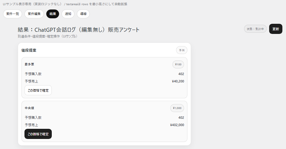 到達条件・価格分布・値段提案・確定操作(UIサンプル)