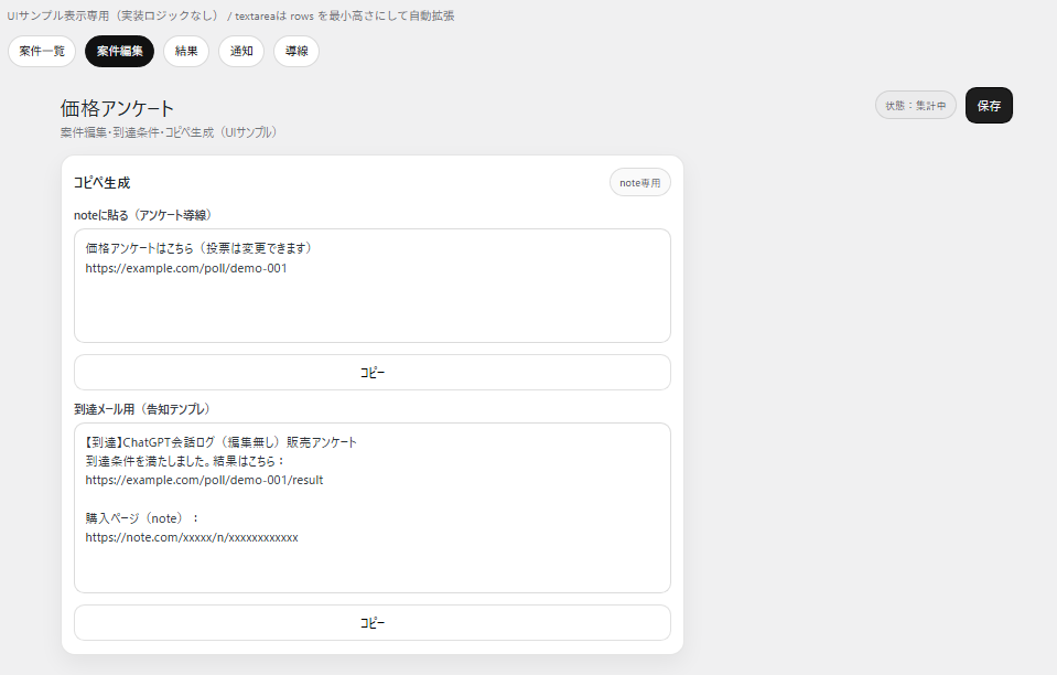 管理画面 UI(価格アンケート:案件編集+到達条件ルール+コピペ生成+結果サマリ)